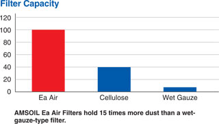 Tests show the AMSOIL Air Filters hold 15 times more contaminants than wet-gauze-type filters.