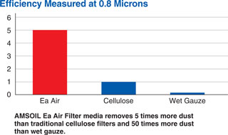 AMSOIL Ea Air Filters rank among the most efficient filters available. The synthetic media removes 5 times more dust than traditional cellulose media alone and 50 times more dust than wet gauze filter media.